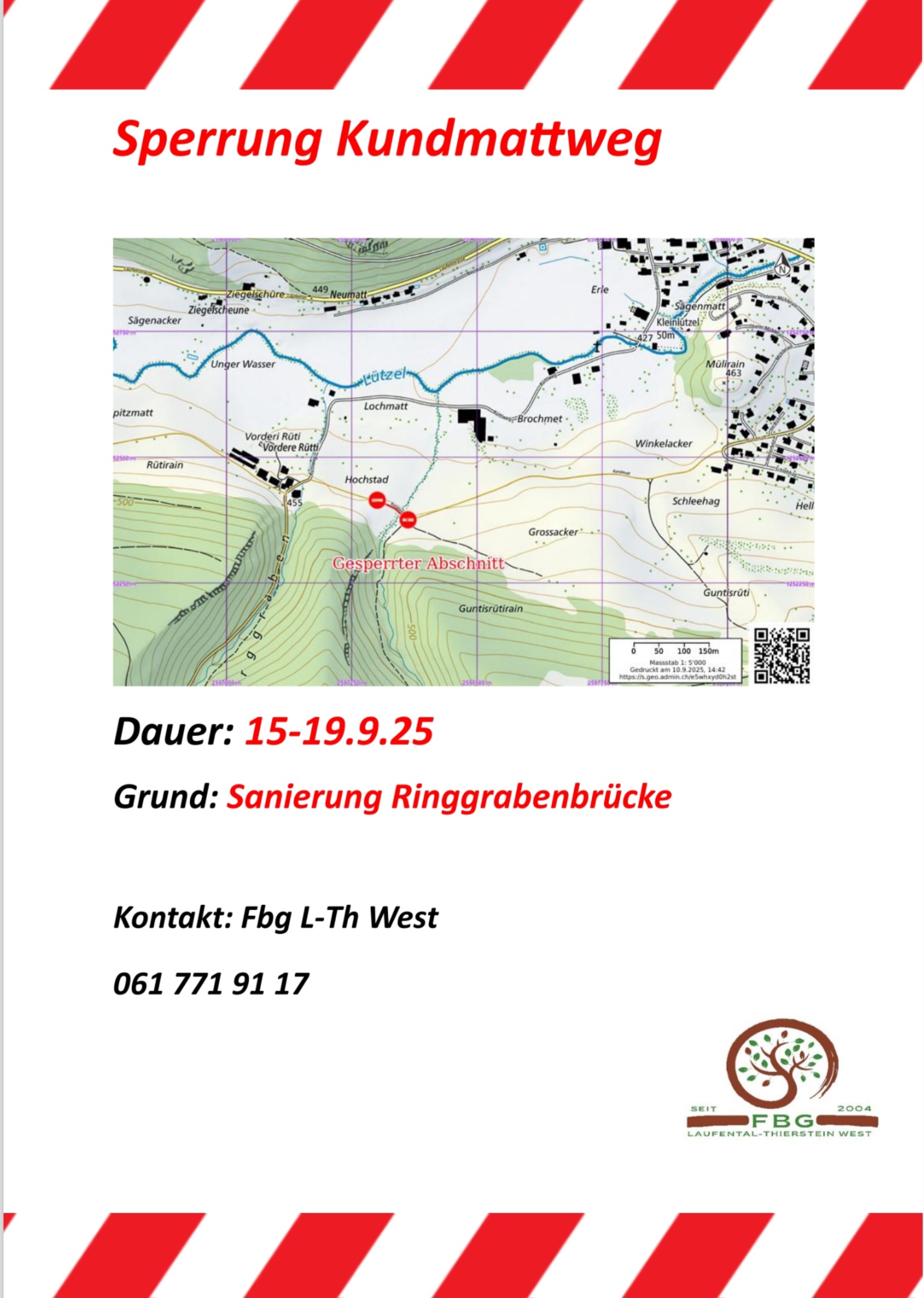 Vom 15. bis 19. September 2025 bleibt die "Kundmatt" wegen Sanierungsarbeiten am Ringgrabenbrückli gesperrt.